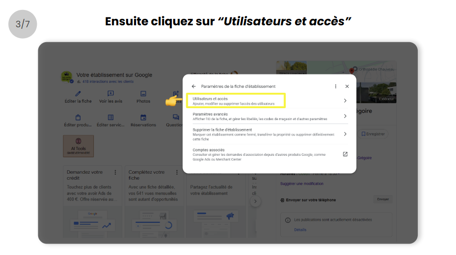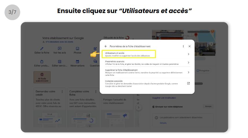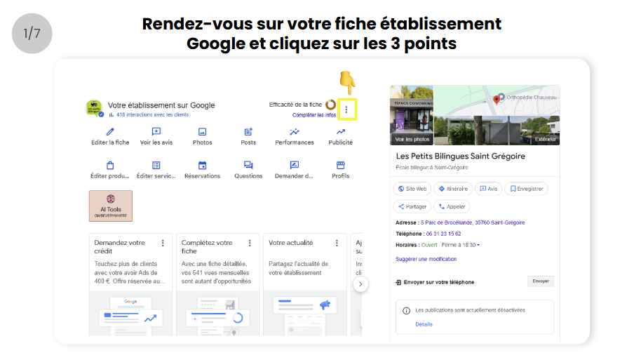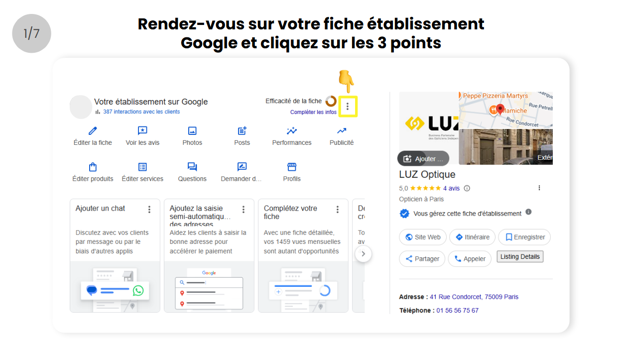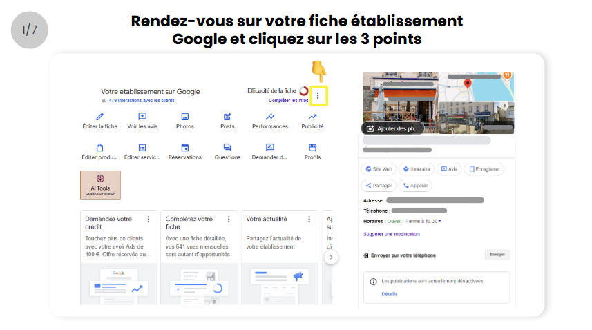- Rendez-vous sur votre fiche d’établissement Google et cliquez sur les 3 points