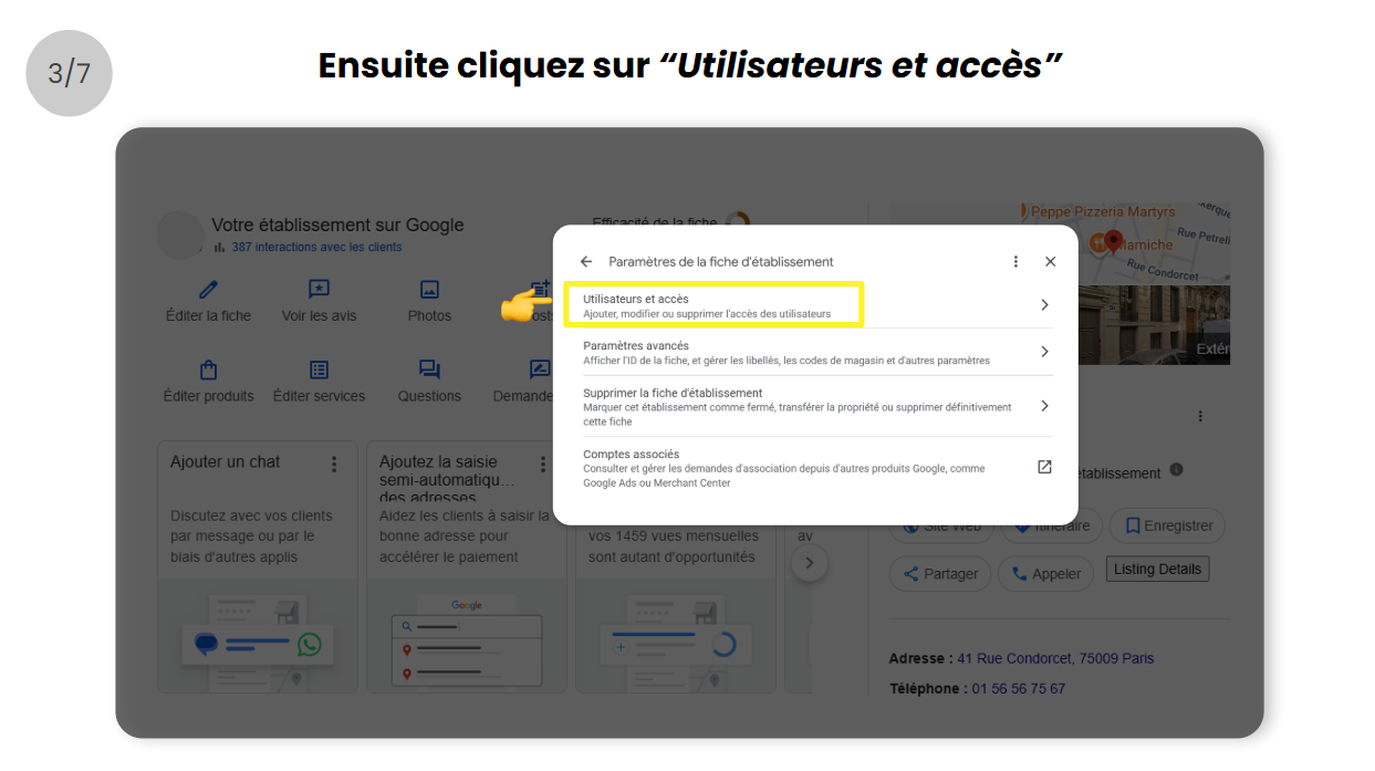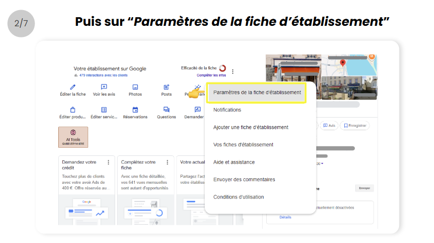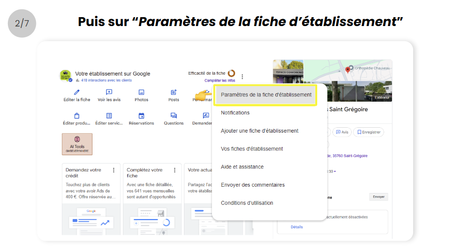 - Puis ouvrez le menu Paramètres de la fiche d’établissement
