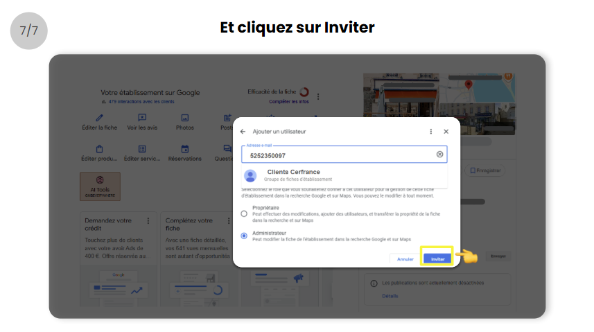 En partageant votre fiche, vous en restez propriétaire et conservez toutes vos photos, avis et autres données existantes. Vous donnez néanmoins accès au réseau Clients Cerfrance aux données suivantes : nom, prénom et coordonnées de la fiche Google (nom de l’établissement, adresse, horaires, téléphone).